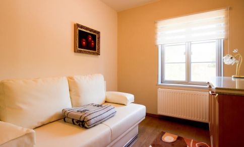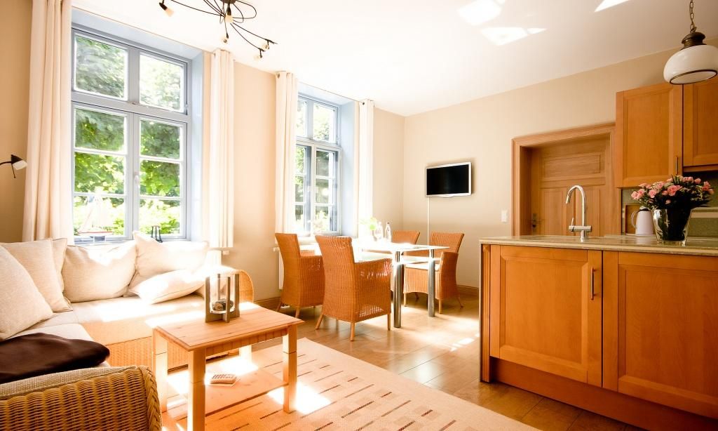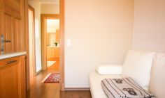 Die Erdgeschosswohnung empfängt dich mit einem hellen Wohnraum, der über eine gemütliche Sitzecke verfügt. Die komfortable Küchenzeile mit Essbereich am Fenster ist unmittelbar in den Wohnraum integriert. Das Schlafzimmer ist mit einem Doppelbett und einem großen Kleiderschrank ausgestattet. Ein separater Raum mit einer Schlafcouch bietet eine zusätzliche Aufbettungsmöglichkeit für zwei Personen. Zur Wohnung gehört ein exklusives Bad mit Dusche und WC.
