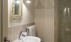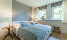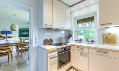 Die Ferienwohnung im Obergeschoss begeistert durch ihren liebevollen und zeitgleich sehr hochwertigen Landhausstil. Es erwartet dich ein eleganter Wohnraum mit gemütlichem Sofa, Sesseln und einem traumhaften Essbereich an bodentiefen Fenstern. Zum exklusiven Wohnraum gehören auch ein Kaminofen und ein wundervoller Blick auf den Garten. Die moderne Küche befindet sich separat und ist ebenfalls sehr komfortabel ausgestattet. Sanfte Naturtöne und -materialien führen sich auch in der Einrichtung der beiden Schlafzimmer fort, die mit exquisiten Doppelbetten und ausgesuchten Deko-Elementen ausgestattet sind. Hier findest du den erholsamen Schlaf, den du dir im Urlaub wünschst. Zwei moderne Bäder mit Dusche/WC vervollständigen die komfortable und 90 Quadratmeter große Ferienwohnung.