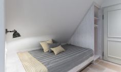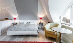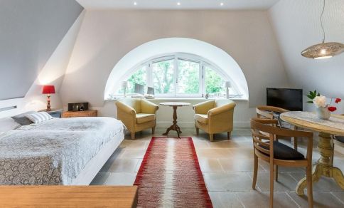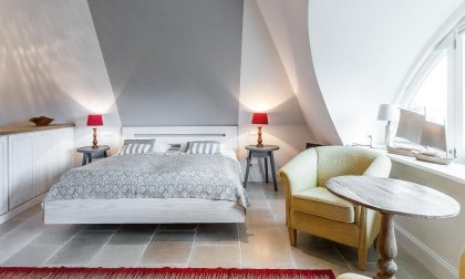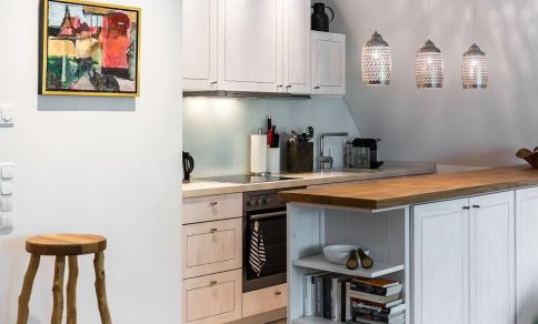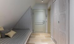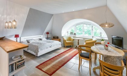 Die Studiowohnung im Dachgeschoss begeistert durch ihre stilvolle Einrichtung und komfortable Aufteilung. Es erwartet dich ein eleganter Wohn- und Schlafraum mit einem gemütlichen Sitzplatz am Gaubenfenster mit traumhaftem Boddenblick, ein Esstisch, ein exquisites Doppelbett und eine moderne Küchenzeile. Sanfte Naturtöne und -materialien sowie ausgesuchte Deko-Elemente machen den Wohlfühl- und Wohnkomfort perfekt. Eine separate Schlafnische mit einem Einzelbett und ein elegantes Bad mit Dusche/WC vervollständigen die komfortable und 50 Quadratmeter große Ferienwohnung.