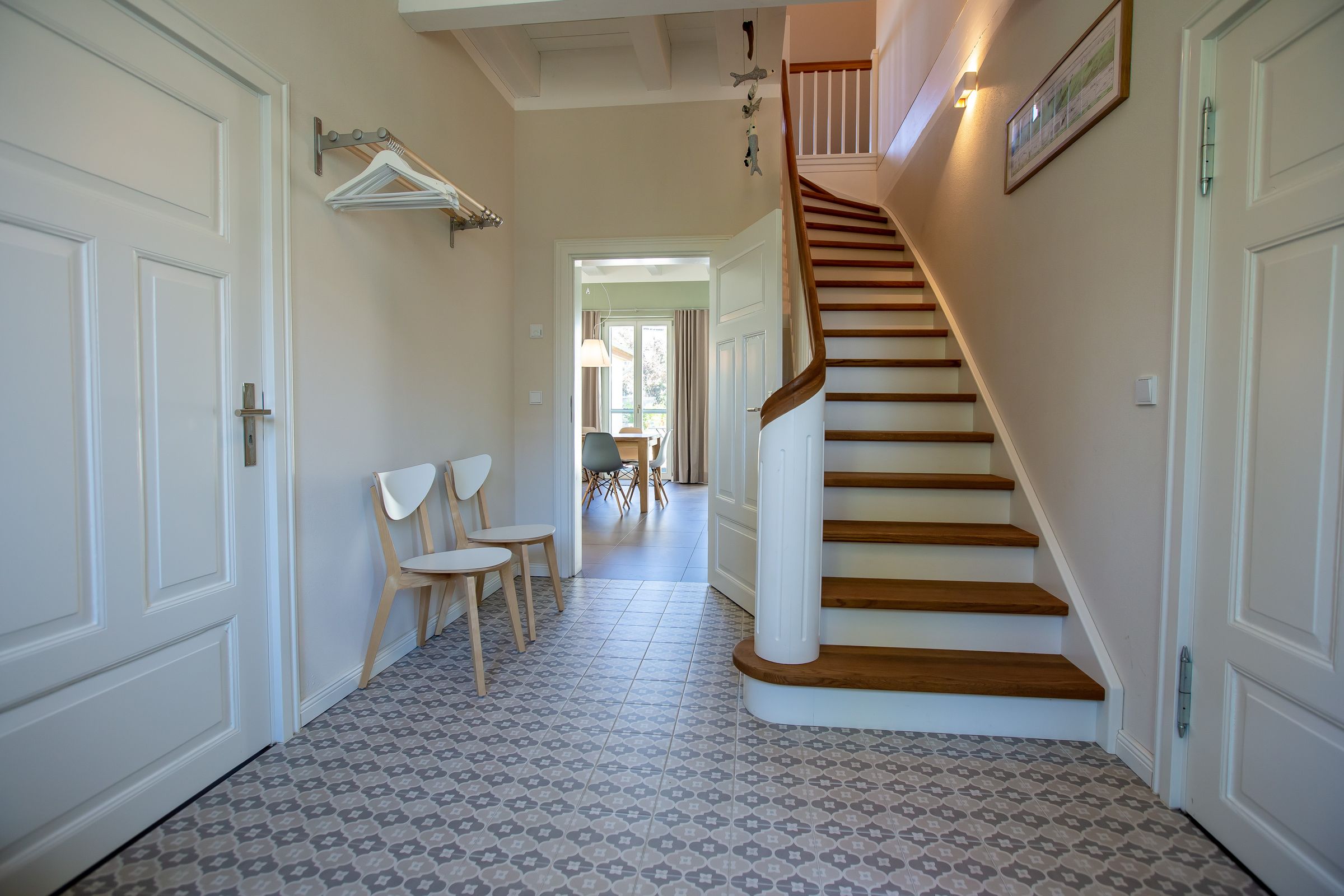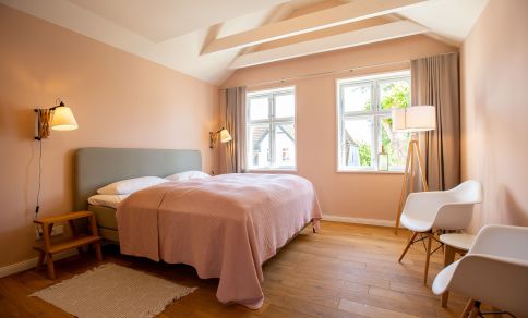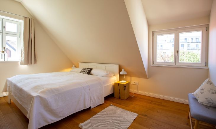 Mit viel Gefühl für die alte Baukultur und Liebe zum Detail wurde das ehemalige Kapitänshaus meisterhaft saniert und restauriert. Herausgekommen ist ein traumhaft schönes Ferienhaus, in dem sowohl die Familie als auch Freunde oder eine Gruppe ausreichend Platz für erholsame Urlaubstage finden. Mittelpunkt des Hauses ist die großzügige und vollausgestattete Küche mit Kamin und Austritt auf die sonnige Terrasse. Hier lässt es sich nach Herzenslust Kochen und Klönen. Das Wohnzimmer mit gemütlicher Sofalandschaft ist durch eine Flügeltür getrennt. Auch der hauseigene Wellnessbereich befindet sich im Erdgeschoss. Dank großzügiger Sauna, Regendusche und Ruhebereich und separatem WC lässt es sich hier zu jeder Jahreszeit und mit allen Sinnen genießen. Über die Holztreppe im Flur gelangt man zu den vier liebevoll gestalteten Schlafzimmern, die mit je einem Doppelbett ausgestattet sind. Zwei stylische Tageslicht-Bäder sowie eine Leseecke mit kleiner Büchergalerie befinden sich ebenfalls im Obergeschoss.