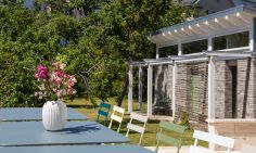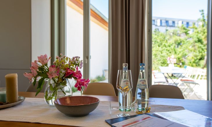 Der Außenbereich wird durch eine große Steinterrasse mit Bestuhlung ergänzt. Von hieraus genießt man einen tollen Blick in den Garten. Vor allem an wärmeren Tagen lädt der mit Lavendel und Gräsern bepflanzte Outdoor-Bereich zum geselligen Essen, Relaxen und Miteinander ein. Des Weiteren gehören zum Ferienhaus vier PKW-Stellplätze, abschließbare Fahrradstellplätze im Gartenhaus, ein Weber-Holzkohlegrill und ein Bollerwagen, in dem die Strandsachen gemütlich transportiert werden können.