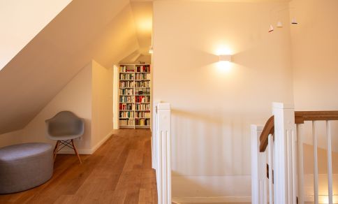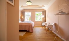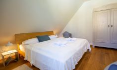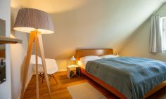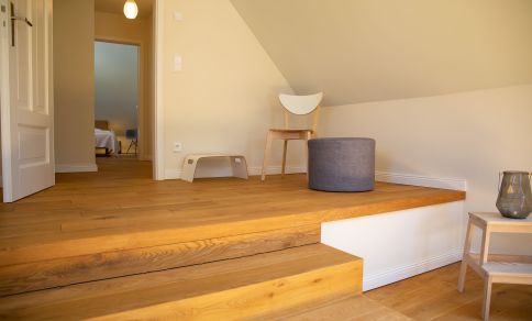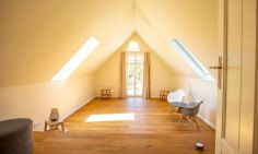 Abgerundet wird dieses wundervolle Urlaubs-Ensemble mit dem Multifunktionsraum, der sich ganz nach Belieben für Yoga, Gruppenarbeit, Coaching, Meditation oder als zusätzlicher Schlafraum (zwei Hotelzustellbetten) nutzen lässt. Insgesamt lassen sich bis zu vier hochwertige Aufbettungen im Gibelzimmer aufstellen, so dass bei Bedarf, dass Haus bis max. 12 Personen genutzt werden kann.