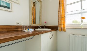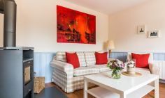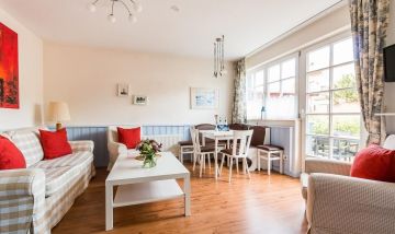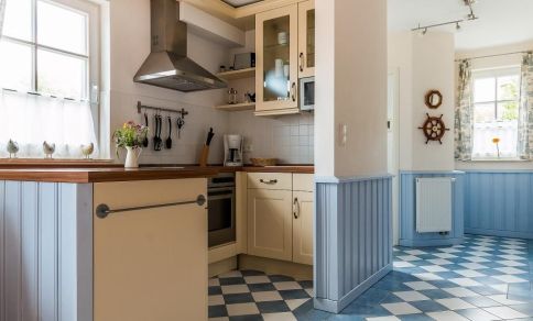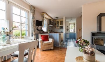 Die Maisonette-Wohnung ist mit individueller, zeitgemäßer und maritimer Wohnlichkeit ausgestattet und strahlt viel Gemütlichkeit aus. Im Erdgeschoss erwartet dich der liebevoll eingerichtete Wohnraum mit TV und DVD- und CD-Player und einem Kaminofen, der für kuschelige Wärme sorgt. Mit im Raum integriert ist die offen gestaltete Küche. Dank der komfortablen Ausstattung mit Geschirrspüler, Ceranherd, Backofen und Mikrowelle lässt diese keine Wünsche offen und lädt zum geselligen Kochen ein. Ein Gäste-WC befindet sich ebenfalls im Erdgeschoss. Die beiden hellen und freundlich eingerichteten Schlafzimmer liegen im Obergeschoss und sind mit einem Doppelbett und einem Kojenbett (für ein bis zwei Personen) ausgestattet. Hier befindet sich auch das Hauptbadezimmer mit Dusche/WC.