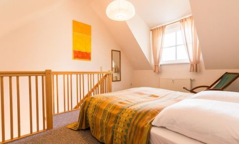 Im Obergeschoss erwartet dich ein freundlicher Wohnraum mit gemütlichem Sofa und TV-Bereich sowie die integrierte Küchenzeile und der Essbereich. Im Dachgeschoss befindet sich eine offene Schlafgalerie mit einem Doppelbett. Das Dachfenster ist zur Seeseite ausgerichtet. Von hier kannst du sogar über die Dächer hinweg einen kleinen Ausblick auf die Ostsee genießen.