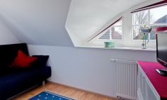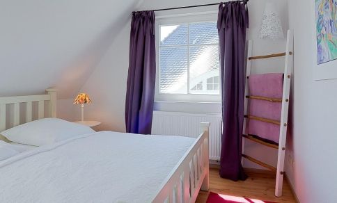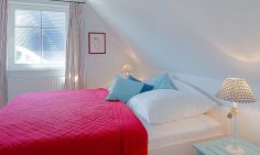 Im Erdgeschoß empfängt dich der einladende Wohnbereich mit einer gemütlichen Sitzecke. Ein Wohlfühlsessel ist direkt im Erker positioniert und bietet einen wunderbaren Blick nach draußen. Der großzügige Esstisch am Kaminofen und die voll ausgestattete Küche sorgen für einen offenen Wohncharakter. Das Gästebad mit Dusche/WC sowie ein abgeschlossener Eingangsbereich mit Garderobe finden ebenfalls in der unteren Etage Platz. Im Dachgeschoss befinden sich zwei Schlafzimmer, die jeweils mit einem Doppelbett ausgestattet sind. Der dritte Schlafraum verfügt über eine Schlafcouch und bietet eine zusätzliche Aufbettung für bis ein bis zwei Personen. Weiterhin schließt sich ein Bad mit Dusche/WC an.