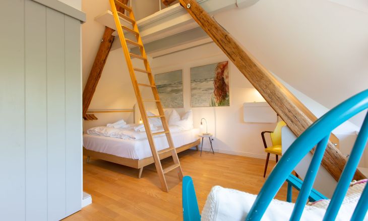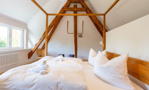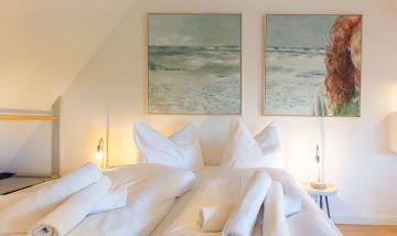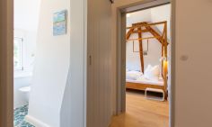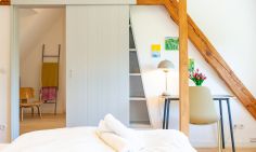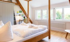 Es ist dieser unerwartete Kontrast zwischen traditioneller Fischlandarchitektur und moderner Inneneinrichtung, die den Aufenthalt in dieser hochwertig sanierten Doppelhaushälfte zu einem ganz besonderen Urlaubserlebnis macht. Freigelegte Holzbalken, schiefe Wände und massive Holztüren sind Zeitzeugen einer uralten Baukultur und zugleich liebevolle Dekoration der stilvollen und eleganten Inneneinrichtung. Die 115 Quadratmeter Wohnfläche verteilen sich auf zwei Etagen. Beim Betreten des Flurs sieht man bereits, dass das Ambiente durch warme Naturmaterialien, helle Farben und eine offene und großzügige Raumaufteilung geprägt ist. Ein komfortables Badezimmer mit Dusche, eine topmoderne Küche mit Esstisch sowie der boheme und künstlerisch gestaltete Wohnbereich befinden sich im Erdgeschoss. Über eine Holztreppe gelangt man in ein weiteres Badezimmer mit Badewanne sowie die zwei Schlafzimmer des Hauses. Die offen gelegten Holzbalken sowie Einbauten wirken wie Designobjekte und bieten ein Höchstmaß an Erholung.