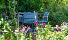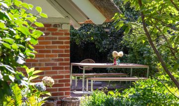 Der Außenbereich begeistert durch seine großzügige Terrasse mit hochwertiger Bestuhlung und weitläufigen Naturgarten. Hier finden sich gleich mehrere lauschige Plätze zum Ausspannen und Durchatmen. Alte Bäume, wilde Sträucher und bunte Blumenbeete finden sich überall auf dem abgeschlossenen Grundstück und sorgen für Urlaubsidylle im eigenen Garten. Eine Außendusche, eine Schaukel, ein Elektrogrill und Sonnenliegen runden das Outdoor-Vergnügen perfekt ab. Des Weiteren gehört zum Ferienhaus ein PKW-Stellplatz auf dem Grundstück.