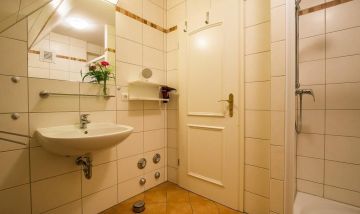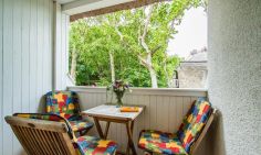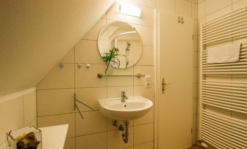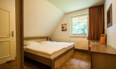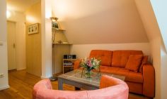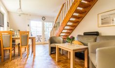 In der Obergeschoss-Wohnung empfängt dich der Wohnraum mit einer gemütlichen Sitzecke. Von hier aus gelangst du auch direkt auf den Balkon und genießt den Blick ins Grüne. Die komfortable Küchenzeile mit Essbereich ist direkt integriert und schafft einen offenen Wohncharakter. Ein Schlafzimmer befindet sich ebenfalls auf dieser Etage und ist mit einem Doppelbett und großzügigen Kleiderschrank ausgestattet. Separat angeschlossen ist das Bad mit Dusche/WC. Über die Holztreppe gelangst du ins Dachgeschoss, dass über ein zweites Schlafzimmer mit Doppelbett sowie ein zweites Bad mit Dusche/WC verfügt.
