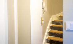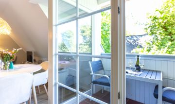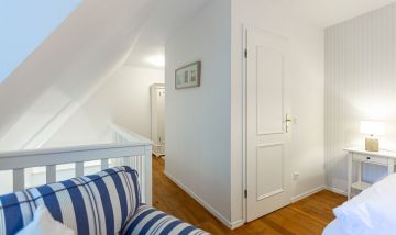 Wohn- und Küchenbereich, das schicke Bad sowie der Balkon mit grünem Ausblick befinden sich auf der ersten Etage. Über eine Treppe geht’s ins obere Schlafzimmer mit offener Empore. Von hier hast du nicht nur ein kuscheliges Refugium zum Träumen, sondern auch einen schönen Blick hinunter in den Wohnraum. Alles wirkt hier ruhig, klar und gleichzeitig wohlig warm – eine Wohnung zum Ankommen, Durchatmen und Wohlfühlen. Ideal für alle, die es modern, schick und trotzdem richtig gemütlich mögen. Zur Ferienwohnung gehört außerdem der PKW-Stellplatz Nr. 5.