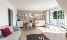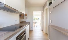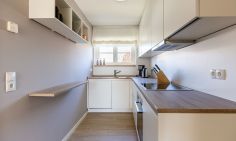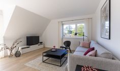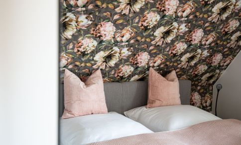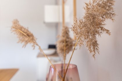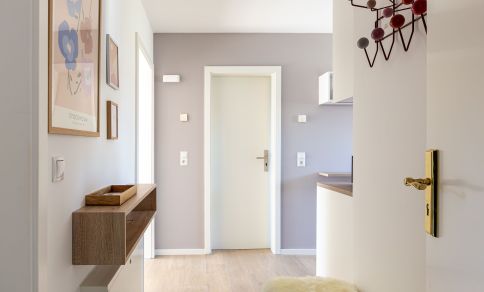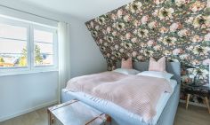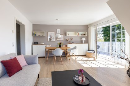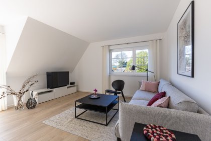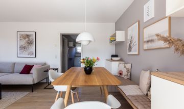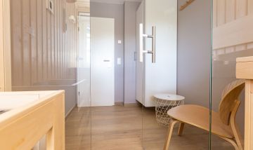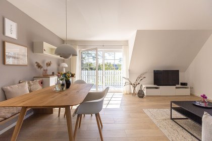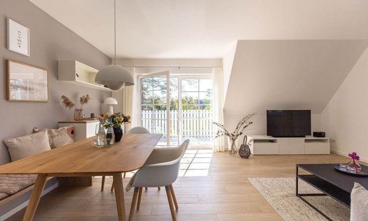 Die Obergeschosswohnung macht ihrem Namen alle Ehre. Zarte, helle Farben, hochwertige Möbel und eine liebevolle Dekoration machen dieses Urlaubsdomizil zum absoluten Lieblingsplatz. Ein besonderes Highlight ist die großzügige Sauna. Vor allem an kalten rauen Ostseetagen ist es ein Genuss, wohltuende Wärme und Erholung in den eigenen vier Wänden zu genießen. Eine Tür weiter befindet sich der Wohnraum mit Essbereich auf der linken und ein gemütliches Sofa vorm TV auf der rechten Seite. Die große Fensterfront mit Zutritt zum Balkon lässt viel Sonnenlicht rein. Zusammen mit den pastelligen Tönen des Interieur erhält der Raum dadurch eine besondere Leichtigkeit. Die Küche befindet sich gegenüber vom Wohnzimmer und fügt sich ganz harmonisch in das stylische Wohnkonzept ein. Hier kann nach Herzenslust gekocht werden. Das macht dank der hochwertigen Geräte und komfortablen Ausstattung besonders viel Spaß. Himmlisch betten lässt es sich in dem stillvollen Schlafzimmer der Wohnung. Es ist der perfekte Rückzugs- und Erholungsort nach einem ereignisreichen Urlaubstag. Vervollständigt wird die wunderschöne Wohnung durch ein modernes Tageslichtbad mit großer Regendusche.