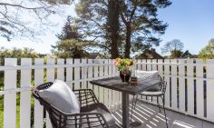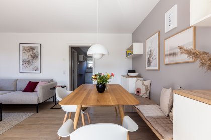 Der Balkon begeistert mit einer modernen Balkonbestuhlung und einem herrlichen Blick ins Grüne. Ob der erste Kaffee des Tages oder einfach ein gutes Glas Wein am Abend – hier kann man die Seele baumeln lassen und einfach Zeit genießen. Es gehört ein PKW-Stellplatz zur Wohnung und einen gemeinschaftlich genutzten Schuppen für Fahrräder. Wir wünschen schon jetzt einen erholsamen Urlaub im Lieblingsplatz.