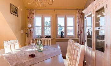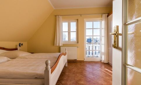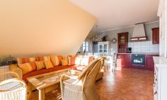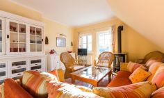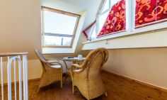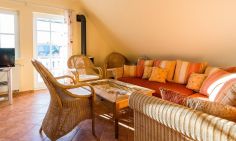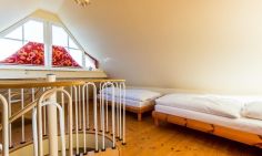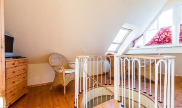 Die Maisonnette-Wohnung befindet sich im Obergeschoss. Hier erwartet dich der Wohnraum, ausgestattet mit einer gemütlichen Sitzecke. Der Süd-Balkon ist direkt vom Wohnbereich aus begehbar. Die gut ausgestattete Küchenzeile und der große Esstisch sind unmittelbar integriert und schaffen einen offenen Wohncharakter. Das Bad verfügt über Dusche/WC und Waschmaschine. Das offene und lichtdurchflutete Dachgeschoss erreichst du über eine Wendeltreppe. Hier befindet sich ein weiterer Schlafbereich mit zwei Einzelbetten und einer kleinen Sitzmöglichkeit.