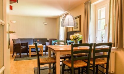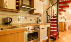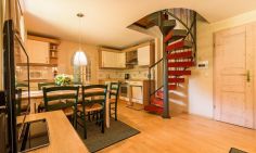 Im Erdgeschoss erwartet dich der freundliche Wohnbereich mit Essplatz sowie eine funktional ausgestattete Küchenzeile. Weiterhin finden das Bad mit Dusche/WC und ein kleiner Flur auf dieser Etage Platz. Die Terrasse ist direkt vom Wohnbereich aus begehbar. Das Obergeschoss ist über eine Wendeltreppe erreichbar. Hier befinden sich ein Schlafzimmer mit einem Doppelbett (160 cm) sowie ein kleines Kinderschlafzimmer mit zwei Einzelbetten.