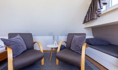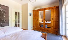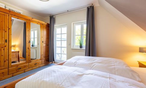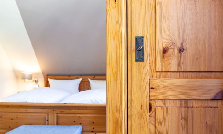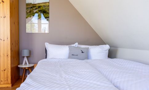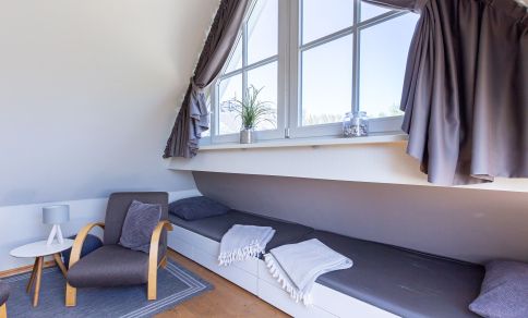 Ein zweites Schlafzimmer befindet sich im oberen Stockwerk, das über eine Wendeltreppe zu erreichen ist. Hier oben genießt man eine behagliche Atmosphäre unter dem Dach – perfekt als Schlaf- oder Rückzugsbereich.