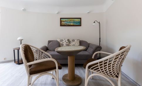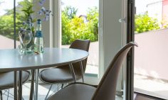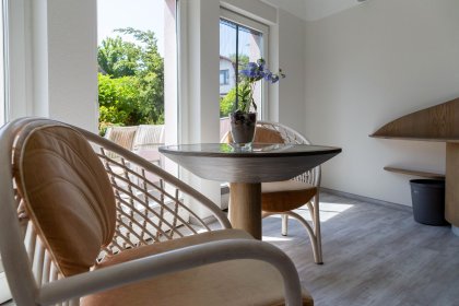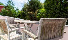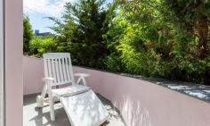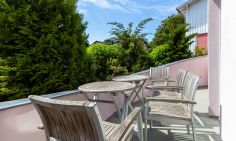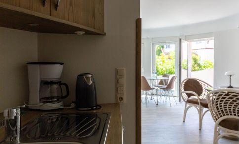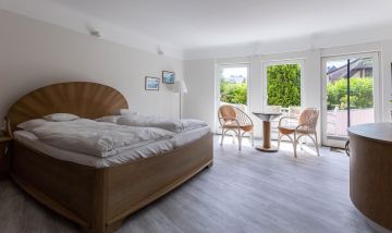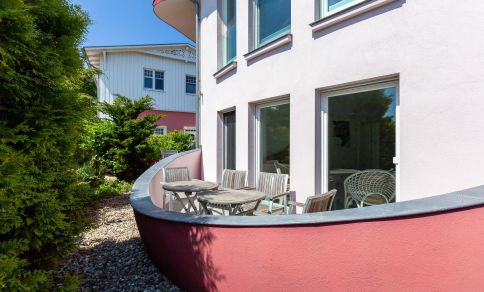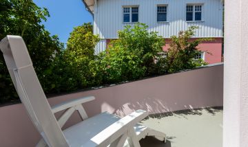 Im Außenbereich steht dir eine kleine sonnige Terrasse mit Tisch und Stühlen zur Verfügung, die von beiden Räumen aus betreten werden kann. Dank der heimischen Pflanzen, die die Terrasse umgeben, kannst du hier ungestört sein, dein Essen unter freiem Himmel genießen oder den Urlaubstag bei einem lauschigen Sommerabend ausklingen lassen. Zur Ferienwohnung gehört außerdem ein PKW-Stellplatz.