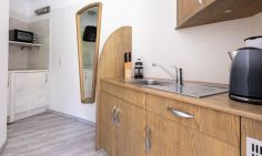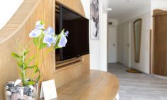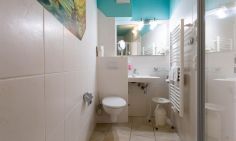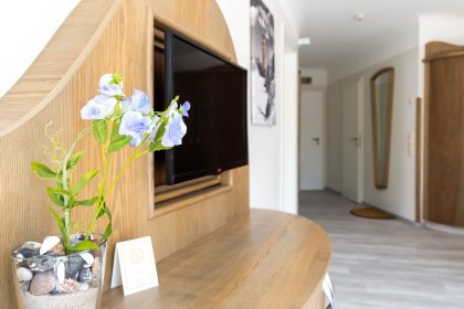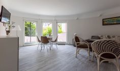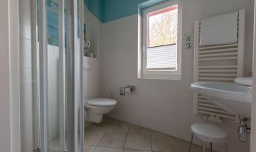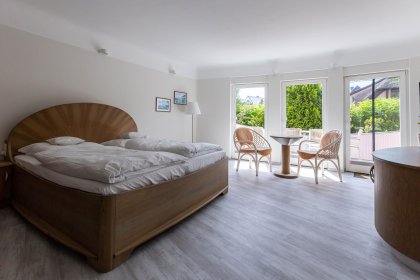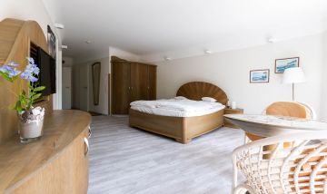 Die Unterkunft „Muschel 1“ befindet sich im Erdgeschoss des Hauses. Großzügige Räume, helle Farben und modernes Mobiliar machen diese Ferienwohnung zu einem besonderen Urlaubsdomizil. Vom Flur mit Garderobe kommst du direkt in das erste Schlafzimmer, dass mit einem großen Doppelbett, Kleiderschrank, Sitzgelegenheit, TV und bodentiefen Fenstern ausgestattet ist. Auch ein Badezimmer mit Dusche und WC kannst du vom Flur aus betreten. Durch eine Tür gelangst du in den großzügigen Wohn- und Schlafbereich. Die vollausgestattete Küchenzeile ist offen integriert und lädt mit Herd, Backofen, Geschirrspüler und Essbereich zum Kochen und Klönen ein. Das gemütliche Sofa kann ausgezogen werden und bietet mit 160 cm Liegefläche einen komfortablen Schlafplatz für bis zu zwei Personen. Abgerundet wird die neu modernisierte Ferienwohnung durch ein zweites Bad mit Dusche und WC.
