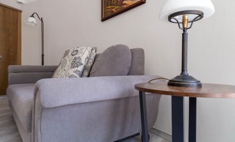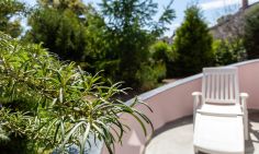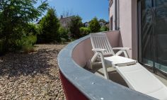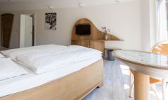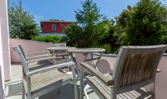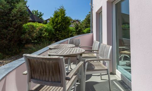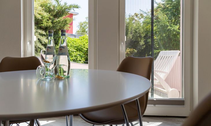 Im Außenbereich steht dir eine kleine sonnige Terrasse mit Tisch und Stühlen zur Verfügung, die von beiden Räumen aus betreten werden kann. Dank der heimischen Pflanzen, die die Terrasse umgeben, kannst du hier ungestört sein, dein Essen unter freiem Himmel genießen oder den Urlaubstag bei einem lauschigen Sommerabend ausklingen lassen. Zur Ferienwohnung gehört außerdem ein PKW-Stellplatz.