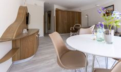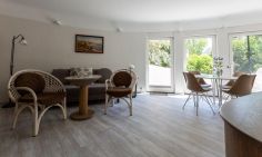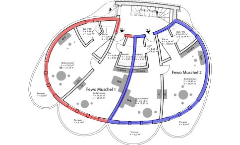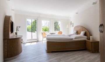 Die Unterkunft „Muschel 2“ befindet sich im Erdgeschoss des Hauses. Großzügige Räume, helle Farben und modernes Mobiliar machen diese Ferienwohnung zu einem besonderen Urlaubsdomizil. Vom Flur mit Garderobe kommst du direkt in das erste Schlafzimmer, dass mit einem großen Doppelbett, Kleiderschrank, Sitzgelegenheit, TV und bodentiefen Fenstern ausgestattet ist. Auch ein Badezimmer mit Dusche und WC kannst du vom Flur aus betreten. Durch eine Tür gelangst du in den großzügigen Wohn- und Schlafbereich. Die vollausgestattete Küchenzeile ist offen integriert und lädt mit Herd, Backofen, Geschirrspüler und Essbereich zum Kochen und Klönen ein. Das gemütliche Sofa kann ausgezogen werden und bietet mit 160 cm Liegefläche einen komfortablen Schlafplatz für bis zu zwei Personen. Abgerundet wird die neu modernisierte Ferienwohnung durch ein zweites Bad mit Dusche und WC.