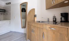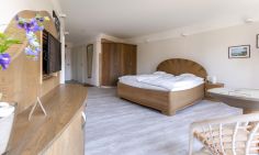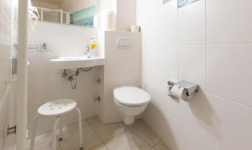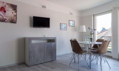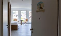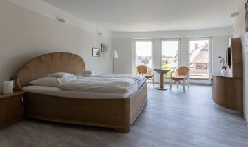 Die Unterkunft „Muschel 3“ befindet sich im ersten Obergeschoss. Großzügige Räume, helle Farben und modernes Mobiliar machen diese Ferienwohnung zu einem besonderen Urlaubsdomizil. Vom Flur mit Garderobe kommst du direkt in das erste Schlafzimmer, dass mit einem großen Doppelbett, Kleiderschrank, Sitzgelegenheit, TV und bodentiefen Fenstern ausgestattet ist. Auch ein Badezimmer mit Dusche und WC kannst du vom Flur aus betreten. Durch eine Tür gelangst du in den großzügigen Wohn- und Schlafbereich. Die vollausgestattete Küchenzeile ist offen integriert und lädt mit Herd, Backofen, Geschirrspüler und Essbereich zum Kochen und Klönen ein. Das gemütliche Sofa kann ausgezogen werden und bietet mit 160 cm Liegefläche einen komfortablen Schlafplatz für bis zu zwei Personen. Abgerundet wird die neu modernisierte Ferienwohnung durch ein zweites Bad mit Dusche und WC.