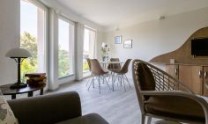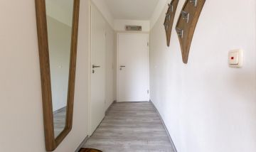 Die Unterkunft „Muschel 4“ befindet sich im ersten Obergeschoss. Großzügige Räume, helle Farben und modernes Mobiliar machen diese Ferienwohnung zu einem besonderen Urlaubsdomizil. Vom Flur mit Garderobe kommst du direkt in das erste Schlafzimmer, dass mit einem großen Doppelbett, Kleiderschrank, Sitzgelegenheit, TV und bodentiefen Fenstern ausgestattet ist. Auch ein Badezimmer mit Dusche und WC kannst du vom Flur aus betreten. Durch eine Tür gelangst du in den großzügigen Wohn- und Schlafbereich. Die vollausgestattete Küchenzeile ist offen integriert und lädt mit Herd, Backofen, Geschirrspüler und Essbereich zum Kochen und Klönen ein. Das gemütliche Sofa kann ausgezogen werden und bietet mit 160 cm Liegefläche einen komfortablen Schlafplatz für bis zu zwei Personen. Abgerundet wird die neu modernisierte Ferienwohnung durch ein zweites Bad mit Dusche und WC.