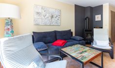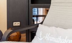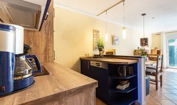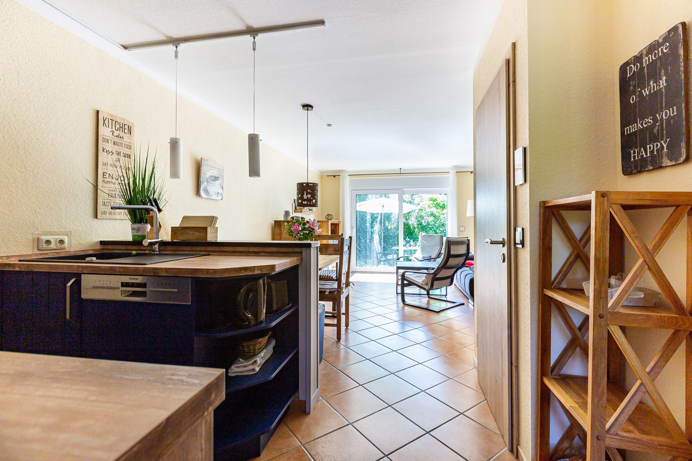 Mittelpunkt der Wohnung ist der großzügige und gemütlich eingerichtete Wohn- und Küchenbereich. Mit dem Sofa am Kamin, dem Esstisch und der voll ausgestatteten Küchenzeile lässt es sich hier nach Herzenslust kochen und klönen. Holzmöbel und helle Farben schaffen zudem eine warme Wohnatmosphäre – ebenso wie die Sonne, die dank der bodentiefen Fenster den Raum mit Licht flutet. Ein Tageslichtbad mit Dusche und WC sowie der Flur mit Garderobe runden das Erdgeschoss ab.