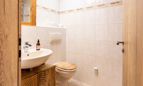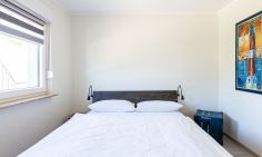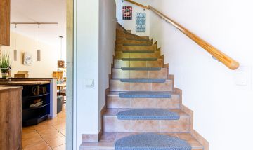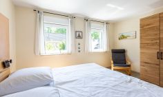 Über die Treppe gelangt man in den ersten Stock und in die beiden Schlafzimmer der Wohnung. Beide sind mit einem hochwertigen Doppelbett, Kleiderschrank und Vorhängen ausgestattet, so dass man hier den erholsamen Schlaf und heimeligen Rückzugsort bekommt, den man sich im Urlaub wünscht. Für noch mehr Wohnkomfort verfügt auch diese Etage über ein Bad mit Dusche, WC und Waschmaschine.