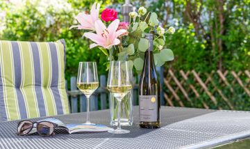 Im Außenbereich steht ein kleiner und komplett eingefriedeter Garten mit Bestuhlung und Sonnenschirm zur Verfügung. Perfekt, um das Frühstück unter freiem Himmel zu genießen oder die lauen Sommerabende draußen ausklingen zu lassen. Zur Ferienwohnung gehört ein PKW-Stellplatz vor dem Haus.