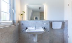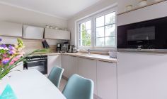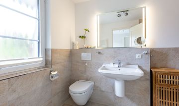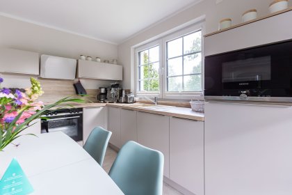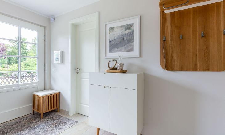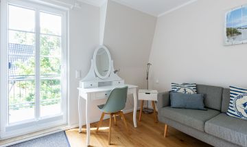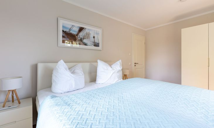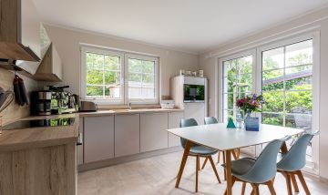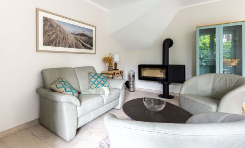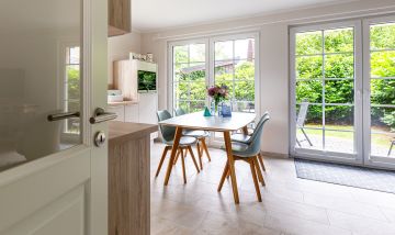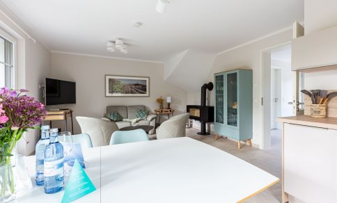 Die wunderschöne Doppelhaushälfte bietet Platz für bis zu vier Personen und besticht durch ihre großzügigen, lichtdurchfluteten Räume im Seaside-Stil. Im Erdgeschoss befindet sich der einladende Wohn- und Essbereich mit direktem Zugang zur Terrasse. Hier könnt ihr bei einer Tasse Kaffee den Tag beginnen oder nach einem langen Strandspaziergang die Abendsonne genießen. Die offene Gestaltung des Wohnraums schafft eine warme und entspannte Atmosphäre, in der ihr euch sofort wohlfühlen werdet. Zudem befindet sich im Erdgeschoss ein modernes Badezimmer mit Sauna und Dusche.