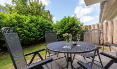 Der Außenbereich lädt mit einer großzügigen Steinterrasse und komfortablen Gartenmöbeln zum Verweilen ein. Der eingefriedete Garten bietet euch dabei ausreichend Privatsphäre, sodass ihr entspannte Stunden an der frischen Ostseeluft ungestört genießen könnt. Zum Ferienhaus gehören außerdem zwei PKW-Stellplätze und abschließbare Fahrradplätze. Die Kombination aus unmittelbarer Nähe zum Meer, hochwertiger Einrichtung und einer traumhaften Lage machen dieses Haus zu einem perfekten Ort für entspannte und erlebnisreiche Tage.