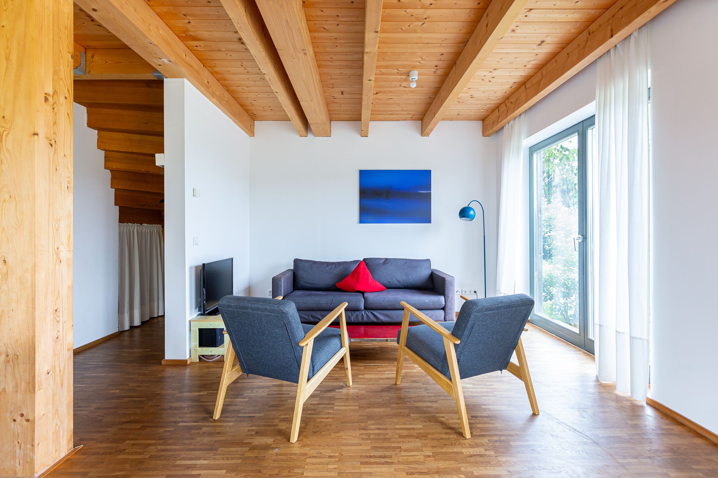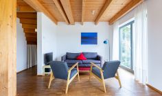 Plus : Ein wunderschönes Haus mit viel Tageslicht und wirklich sehr, sehr ruhig gelegen in einem sehr schönen Ort. In der Küche war alles vorhanden, was man so braucht im Urlaub. Wir waren zu zweit eine Woche dort. Man darf seinen Hund mitbringen, was wir sehr großzügig fanden, denn unten liegt ein geölter Holzboden, der sehr schön ist. Minus : Die Inneneinrichtung ist geradlinig, was wir sehr mögen, es fehlt aber an ein paar wichtigen Dingen um es auch behaglich zu finden. Um den Esstisch und die Küche rum ist alles top. Allerdings steht im unteren Raum nur eine Leselampe, Es gibt auch keine weitere gemütliche Beleuchtung, nur helles Deckenlicht. Wenn beide lesen möchten hat man hier ein Problem. Die Sessel, eher Garten Lounger sind nicht zum längeren sitzen gemacht. Die oberen Schlafzimmer sind sehr ungemütlich. Die Nachtischlampen machen grelles Licht und sind zum Lesen im Bett zu niedrig. Die Bekleidung kann nur in offenen, quadratischen Kästen, die an der Wand hängen oder an Haken hängend untergebracht werden. Was einer schönen Atmosphäre nicht förderlich ist. Ich möchte meine Bekleidung nicht die ganze Zeit sehen wenn ich im Bett liege. Fazit - um sich bei schlechtem Wetter gern im Haus aufzuhalten fehlt es an Wärme in der Einrichtung. Ach ja, die Aussicht ist auch nicht mehr so wie auf den Fotos gezeigt. Der Weitblick wird inzwischen durch eine Hecke begrenzt. Man hat allerdings einen sehr schönen Himmelsblick
