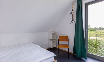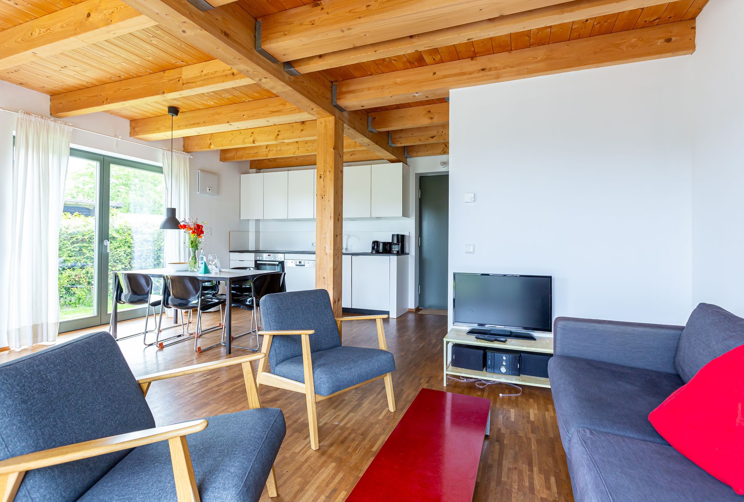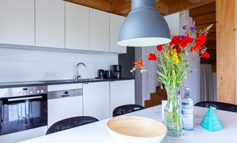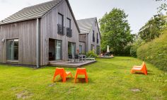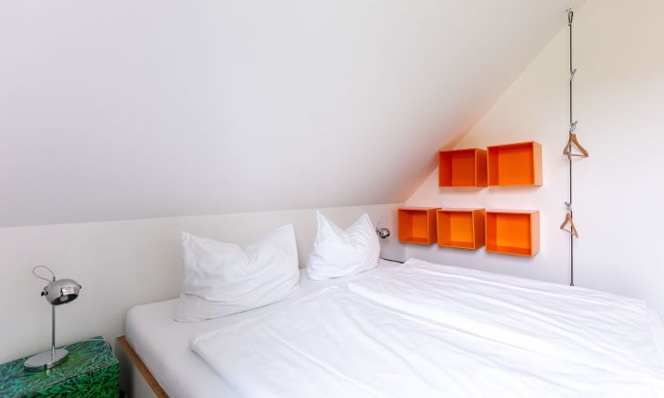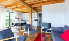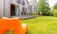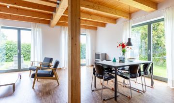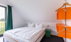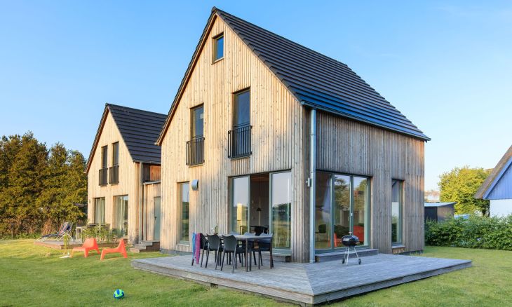 Eine moderne Architektur und ökologische Holzbauweise sind charakteristisch für dieses Landhaus nahe der Ostsee. Im Erdgeschoss erwartet dich ein großzügiger und lichtdurchfluteter Wohnraum mit klarem Design und retroinspirierten Möbeln. Mit der Holzbalkenkonstruktion in der Decke und dem Echtholzparkett wird das Naturmaterial Holz auch im Innenbereich wieder aufgegriffen und sorgt für eine tolle Wohnatmosphäre. Die Küchenzeile und der große Esstisch fügen sich harmonisch in den Wohnbereich ein. Ein begehbare Garderobe befindet sich ebenfalls auf der unteren Etage. Im Obergeschoss erwarten dich zwei cleane Schlafzimmer, die jeweils mit einem Doppelbett (180 cm und 140 cm) ausgestattet sind - handgefertigt vom Tischler. Ein modernes Badezimmer mit Dusche/WC rundet das Urlaubsdomizil perfekt ab.