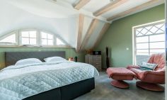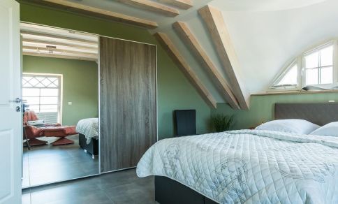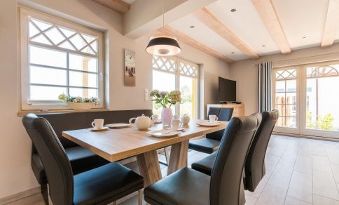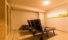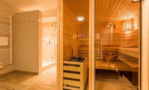 Das Obergeschoss begehst du über die wertige Echtholztreppe. Dort erwartet dich ein großes Schlafzimmer mit Doppelbett, TV-Gerät und angrenzendem Balkon mit Blick auf die Ostsee - Sundown-Garantie inklusive. Ein weiteres Doppelbett-Zimmer verfügt ebenfalls über einen TV-Gerät und wunderschönen Meerblick. Auch das zweite Badezimmer mit Wanne, Dusche und WC findet hier seinen Platz. Beim Baden kannst du den Blick über die Dünen auf die Ostsee genießen. Im großen, imposanten Spitzboden finden sich drei große Einzelbetten und eine kleinen Spielecke. Dieses Dachgeschoss ist ein idealer Rückzugsort für große und kleine Ostsee-Fans. Das Untergeschoss hält eine kleine Wellnessoase mit Sauna, Dusche und Ruhebereich für dich bereit. Wer im Urlaub fit bleiben möchte, kann den angrenzenden Fitnessraum, ausgestattet mit einem Heimtrainer, einem Crosstrainer, einer Fitnessbank und zusätzlichem TV-Gerät nutzen.