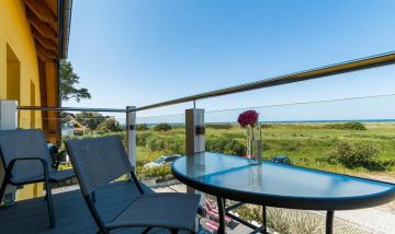 Der Außenbereich begeistert mit drei großzügigen Terrassen mit herrlichem Blick auf die Dünenlandschaft der Ostseeküste. Die hochwertige Ausstattung beinhaltet ausreichend Sonnenliegen, Sonnenschirme, gemütliche Gartenmöbel und moderne Bodenstrahler. Genieße hier dein Frühstück am Morgen oder relaxe tagsüber und am Abend mit einem Buch oder einem guten Glas Wein. Zum Ferienhaus gehören außerdem zwei PKW-Stellplätze. Ein weiteres Highlight ist der hauseigene Strandkorb, der dir vor allem in der warmen Jahreszeit ein schattiges Plätzchen auf der Terrasse bietet.