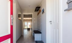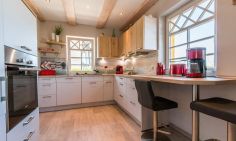 Diese großzügige Haushälfte mit 160 m² verspricht mit seiner maritim-modernen Ausstattung absoluten Wohnkomfort. Durch die Darßer Haustür und über den einladenden Eingangsbereich mit Garderobe gelangst du direkt in den weitläufigen und freundlichen Wohnraum. Hier erwartet dich eine gemütlichen Sitzecke direkt am großen Kamin. Dieser wird mit Gas betrieben und kann jederzeit mittels einer Fernbedienung in Betrieb genommen werden - erholsame Stunden werden dir so bequem per Knopfdruck beschert. Oder du lässt dich über den extragroßen TV unterhalten. Die offene Küchenzeile mit Essbereich fügt sich harmonisch in den Wohnbereich ein. In der unteren Etage befindet sich weiterhin ein Gäste-Bad mit Dusche/WC.