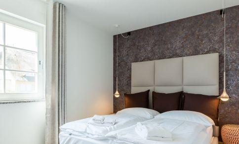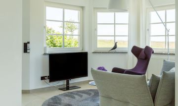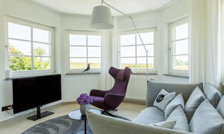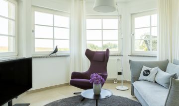 Der mit seinen vielen Fenstern gesäumte und offen gestaltete Erker ist Mittelpunkt der Wohnung. Hier befindet sich der Loungebereich mit hochwertigem Designersofa und -sessel auf der einen Seite sowie die vollausgestattete Küche mit Esstisch auf der anderen. Die dunklen Farbakzente im Schlafzimmer sorgen zusammen mit dem hochwertigen Boxspringbett für einen traumhaften Rückzugsort und erholsamen Schlaf. Abgerundet wird die Ferienwohnung durch das moderne Badezimmer mit bodengleicher Regendusche, Handtuchtrockner und WC. PUR A2 schafft, wie alle anderen PUR-Ferienobjekte - durch die reduzierte Ästhetik einen ganz besonderen Wohncharakter und zeigt die Liebe der Eigentümer zu Design und Interieur.