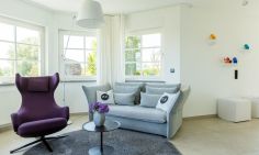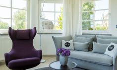 In Gegensatz zum traditionellen Reetdachhaus, steht das sehr moderne Interieur von PUR A2. Designermöbel, spannende Farbkontraste, klare Linien, Kunstobjekte und der minimalistische Einrichtungsstil sind typisch für das PUR-Wohnkonzept und schaffen einen gelungenen Mix aus Gemütlichkeit und Modernität.