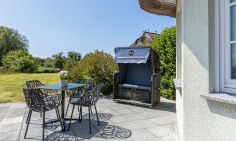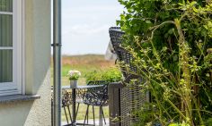 Der Außenbereich begeistert mit einer großzügigen Steinterrasse, die du vom Wohnraum aus betrittst. Von hier genießt du einen traumhaften Weitblick über die Wiesenlandschaft und den Saaler Bodden bis zum Horizont. Es ist eben einfach PUR! Zur Ferienwohnung gehört ein PKW-Stellplatz.