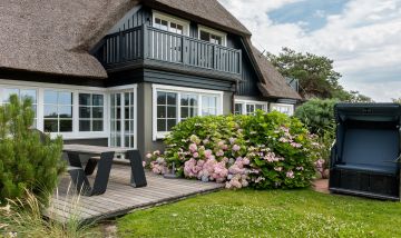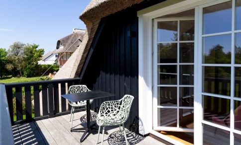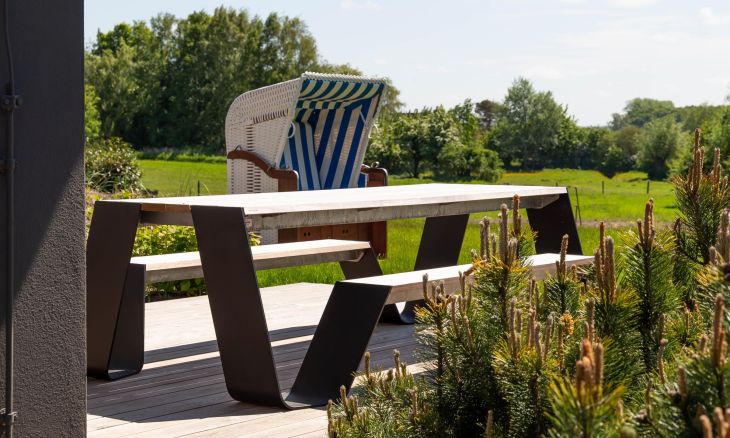 Auf der großzügigen Terrasse im Außenbereich genießt du einen unverbauten Blick über weite Wiesen bis zum Bodden. Dabei sorgt die aufwendig gestaltete Gartenarchitektur für ausreichend Privatsphäre, so dass du dich auch unter freiem Himmel entspannen kannst. Dir stehen zudem zwei PKW-Stellplätze, eine E-Bike-Ladestation und ein gemeinschaftlich genutzter Grillplatz im hinteren Bereich des weitläufigen Gartens zur Verfügung.