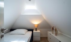 Im Erdgeschoss erwartet dich ein gemütlich eingerichteter und lichtdurchfluteter Wohnraum mit Austritt zur großen Terrasse, die direkt in den Garten führt. Die offene Küchenzeile und der Essbereich an bodentiefen Fenstern lädt zum gemeinsamen Kochen und Klönen ein. Weiterhin befindet sich in der unteren Etage ein Gäste-WC sowie der Hauswirtschaftsraum, in dem eine Waschmaschine, die gegen Gebühr nutzbar ist (2x1 EUR Münzen je Waschgang) untergebracht ist. Im ersten Obergeschoss befinden sich zwei Schlafzimmer mit jeweils einem Doppelbetten sowie ein Bad mit Dusche/WC und Badewanne. Von dieser Etage genießt du sogar einen kleinen Ausblick über die Rohrdächer hinweg auf den Bodden. Das Dachgeschoss verfügt des Weiteren über eine offene Schlafgalerie mit einem Einzelbett.