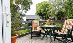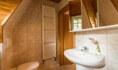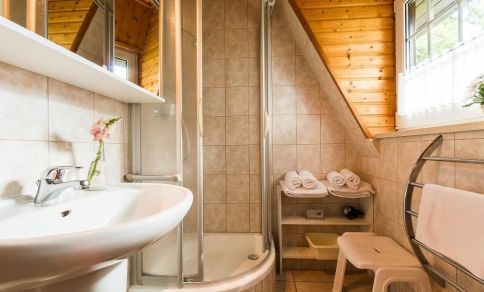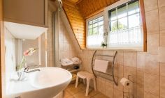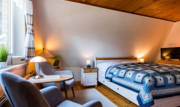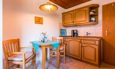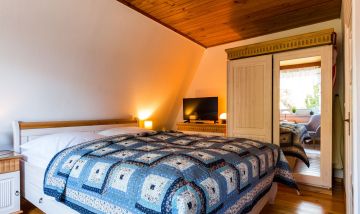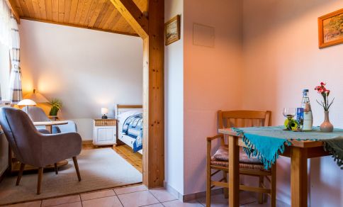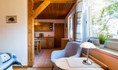 Die kleine und offen gestaltete Dachgeschosswohnung ist über eine Außentreppe erreichbar und bietet dir einen gemütlichen Komfort für zwei Personen. In dem kombinierten Wohn- und Schlafraum erwarten dich ein Doppelbett, ein kleiner Sitzbereich mit TV, ein separater Esstisch und eine Miniküche (Zweiplattenherd). Das Bad mit Dusche/WC schließt sich direkt an. Vom Schlafbereich gelangst du auf die herrliche Dachterrasse mit Blick ins Grüne. Hier kannst du entspannte Urlaubsstunden verbringen und die Seele baumeln lassen.