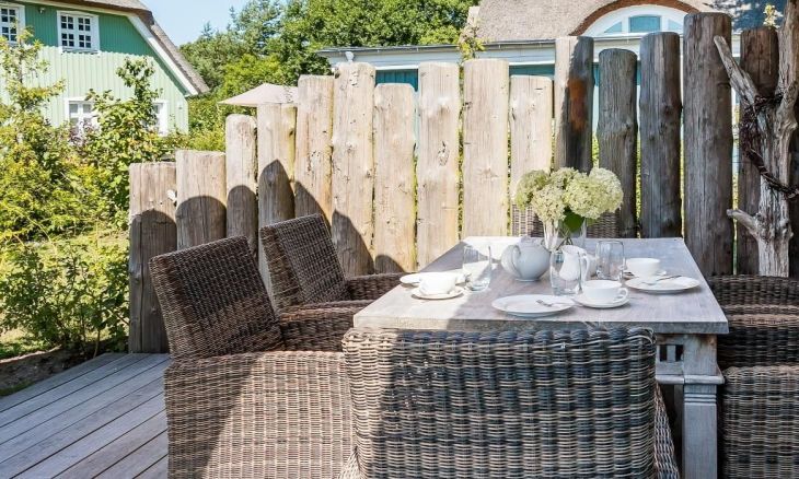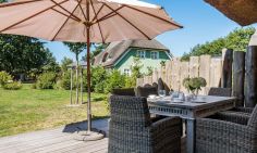 Für erholsame Stunden nach einem ereignisreichen Tag steht dir eine große Holzterrasse zur Verfügung. Mit Holzbuhnen und Blick ins Grüne lässt es sich hier genauso gut entspannen wie am Strand. Zum Ferienhaus gehört außerdem ein PKW-Stellplatz.