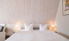 Über eine separate Außentreppe gelangst du in die Wohnung. Es erwartet dich ein modern und sehr gemütlich kombinierter Wohn- und Schlafraum mit hochwertiger Couch und großem Smart-TV. Die holzvertäfelten hellen Wände sorgen für zusätzliche Gemütlichkeit. Ein kleiner Esstisch sowie ein großes Doppelbett fügen sich harmonisch in den Wohnraum ein. Die helle und gut ausgestattete Küchenzeile schließt sich direkt an den Wohnraum an. Das moderne Tageslichtbad ist ebenfalls separat und verfügt über eine Dusche/WC.