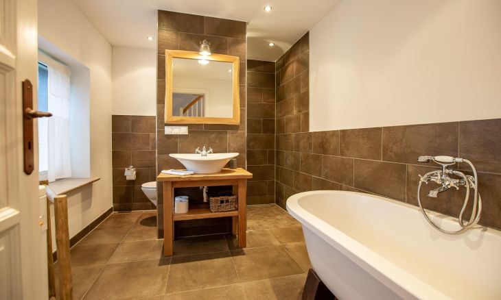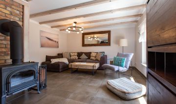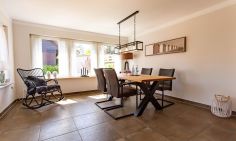 Typisch ländlich mutet dieses tolle Ferienhaus mit seiner hochwertigen Landhaus-Einrichtung, den natürlichen Farben und Materialien sowie den detailverliebten Deko-Elementen an. Der offene Wohn -und Küchenbereich lädt zum kommunikativen Kochen und gemütlichem Klönen auf dem modernen Sofa am Kamin oder in der Veranda ein. Ein gemütliches Schlafzimmer mit einem Doppelbett (180 cm) und ein sehr modernes Bad mit freistehender Badewanne und WC runden das Erdgeschoss ab. Im Obergeschoss erwarten dich zwei weitere Schlafzimmer mit je einem Doppelbett (160 cm und 140 cm). In einem der Schlafzimmer befindet sich ein zusätzliches TV-Gerät. Solltest du doch einmal in deinem Urlaub arbeiten müssen, dann steht dir ein moderner Schreibtisch im hellen Galeriebereich des Dachgeschosses zur Verfügung. Ein zusätzliches kleines Wohlfühl-Badzimmer mit Dusche/WC auf dieser Etage macht den Wohnkomfort perfekt.