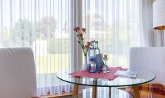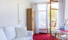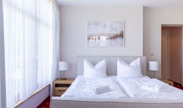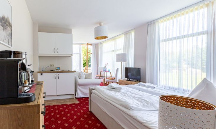 Das kleine Einraum-Appartement ist passend zum Strand mit Holz und hellen Farben eingerichtet. Im Wohn- und Schlafraum befinden sich eine kleine Sitzgelegenheit, ein Doppelbett, eine Miniküche und ein Esstisch an bodentiefen Fenstern. Das separate Bad mit Dusche/ WC schließt sich dem Wohnraum an.
