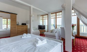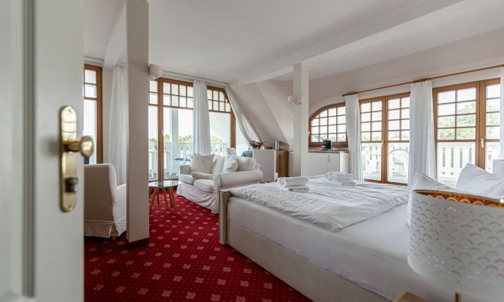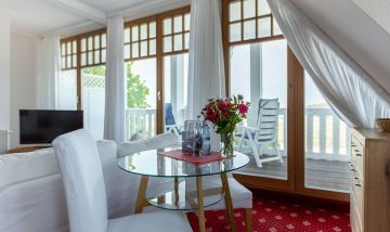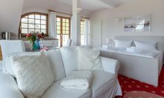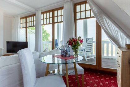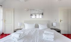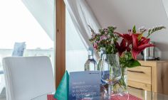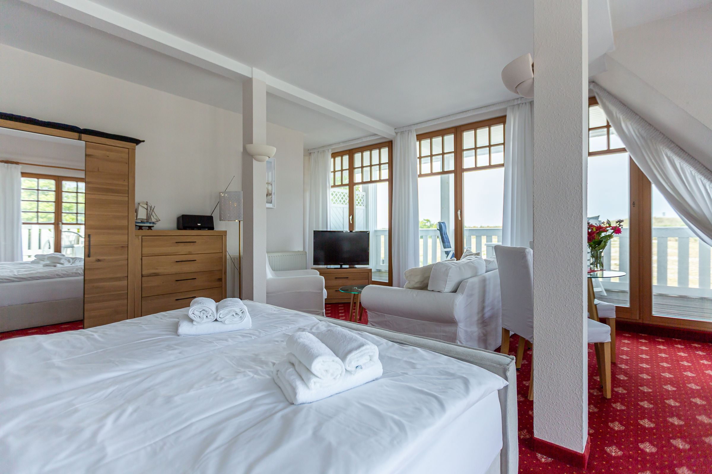 Das gemütliche Einraum-Appartement im ersten Stock wurde Anfang 2024 mit neuen Möbeln ausgestattet und ist passend zum Strand mit Holz und hellen Farben eingerichtet. Im Wohn- und Schlafraum befinden sich eine kleine Sitzgelegenheit, ein Doppelbett, eine Miniküche und ein Esstisch an bodentiefen Fenstern. Das separate Bad ist großzügig mit Badewanne/ WC/ und Bidet ausgestattet.