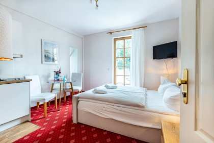 Das gemütliche Einraum-Appartement wurde Anfang 2024 modernisiert und mit neuen Möbeln ausgestattet. Es befindet sich im ersten Stock und ist passend zum Strand mit Holz und hellen Farben eingerichtet. Im Wohn- und Schlafraum befinden sich eine kleine Sitzgelegenheit, ein Doppelbett (140 cm), eine Miniküche und ein Esstisch an bodentiefen Fenstern. Das separate Bad ist mit Dusche/WC ausgestattet.