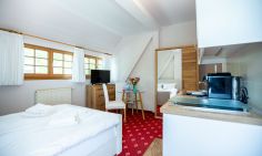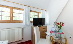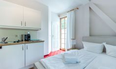 Das gemütliche Einraum-Appartement im ersten Stock ist passend zum Strand mit Holz und hellen Farben eingerichtet. Im Wohn- und Schlafraum befinden sich eine kleine Sitzgelegenheit, ein Doppelbett (140 cm), eine Miniküche und ein Esstisch an bodentiefen Fenstern. Das separate Bad ist mit Dusche/WC ausgestattet.