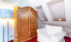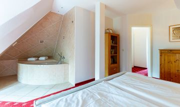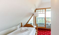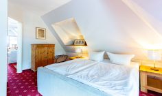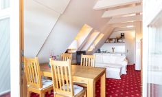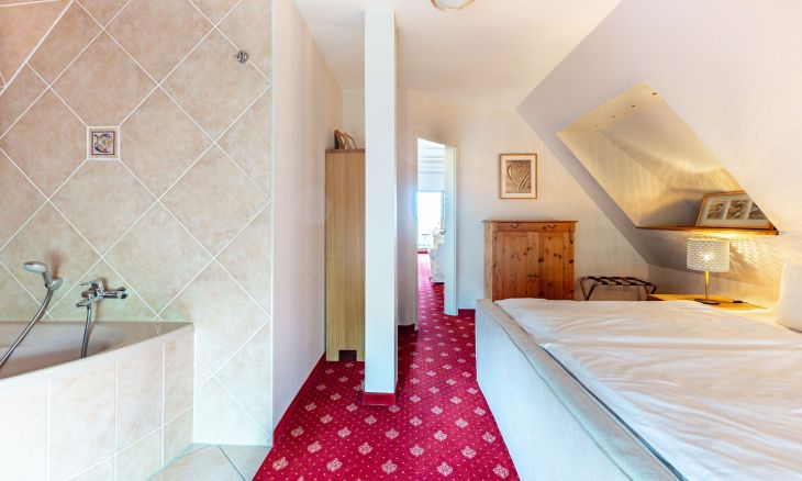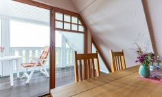 Die Ferienwohnung liegt im Dachgeschoss des Hauses und begeistert durch einen wunderschönen Meerblick. Im Wohnraum befinden sich eine Sitzgelegenheit mit TV-Bereich, eine Miniküche und ein Esstisch. Das Hauptschlafzimmer bietet neben dem Doppelbett die Besonderheit, dass die Eckbadewanne hier integriert wurde. Ein kleines Bad mit Waschbecken und Toilette befindet sich separat. Ein kleines zweites Schlafzimmer mit einem Einzelbett runden die Ferienwohnung ab.