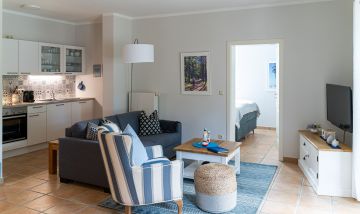 Die liebevoll eingerichtete Ferienwohnung „Glück“ ist durch maritimes Design und eine hochwertige Ausstattung geprägt. Der Wohnraum mit seinem gemütlichen Sofa und großen TV, der komfortabel ausgestatteten Küche und dem lieblich gestalteten Essbereich ist das Herzstück der Wohnung. Farben inspiriert von Himmel und Meer, natürliche Materialien und lichtdurchflutete Räume sorgen in der gesamten Wohnung für ein traumhaft schönes Urlaubs-Feeling. So auch im Schlafzimmer, das mit seinem hochwertigen Boxspringbett einen erholsamen Schlaf und heimeligen Rückzugsort garantiert. Das Badezimmer beinhaltet klassisch Dusche, WC und Handtuchhalter und rundet den Wohnkomfort für zwei oder drei Personen mit und ohne Hund ab. „Glück“ für jeden, der hier seinen Urlaub verbringt.