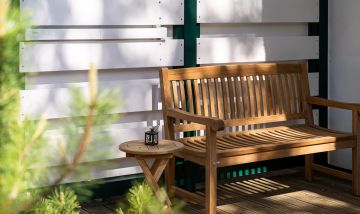 Der Außenbereich hält eine großzügige Holzterrasse mit Liegestühlen, Sonnenschirm und kleinen Garten bereit. Nach einem ausgiebigen Urlaubstag kann man hier ganz privat für sich entspannen - unter freiem Himmel, im Hintergrund das sanfte Murmeln des Meeres und mit Blick in die grüne Umgebung, in der vielleicht gerade ein Reh vorbeizieht.
